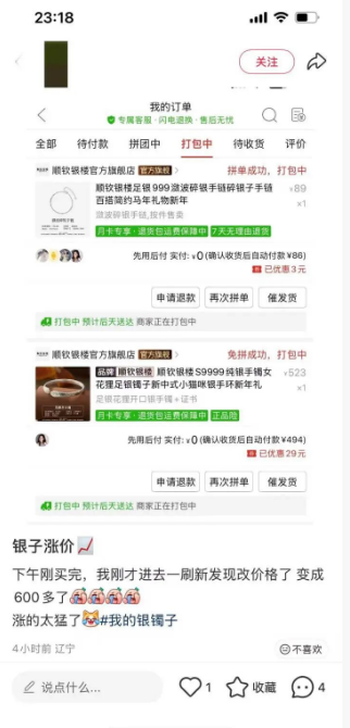 一位网友发现,半天前花500多元买的银手链,还没发货已经涨了大几十。