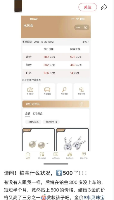 网友直呼:“铂金300多元没上车,短短半个月,竟然站上了500元的价格,结婚三金的价格又高了三分之一,救救孩子吧!”