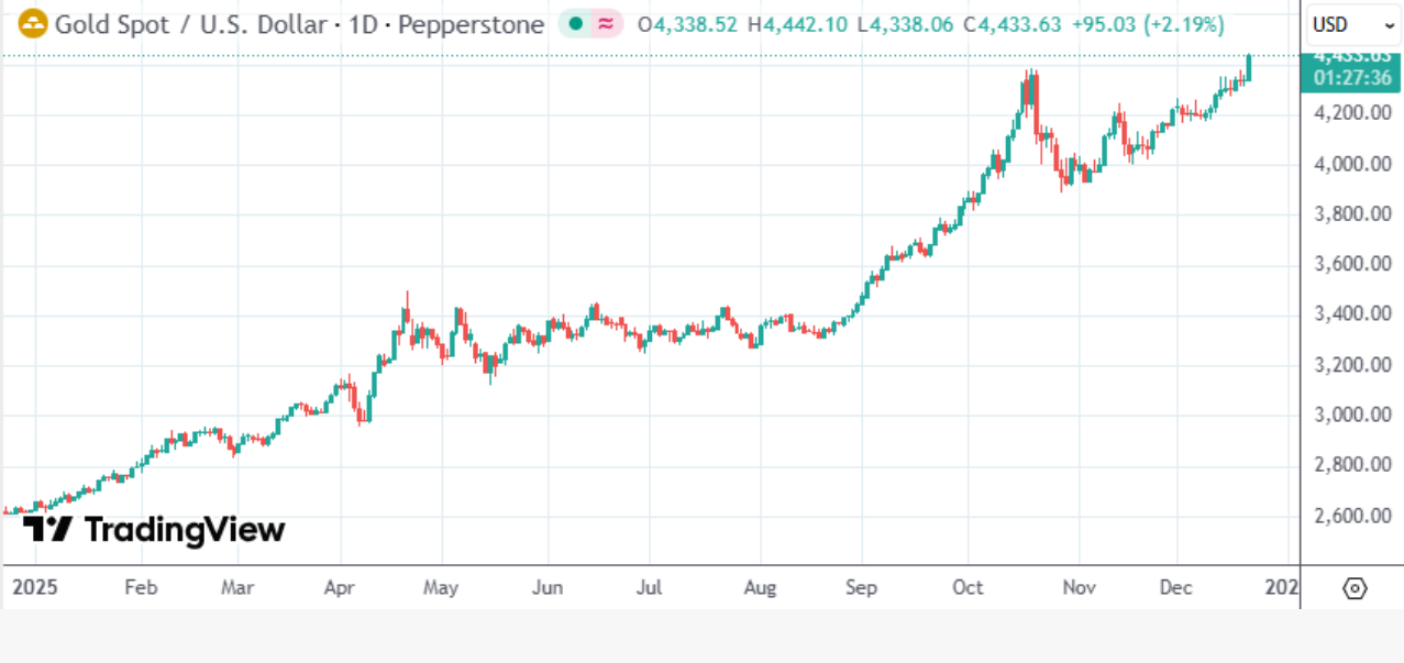 具体行情显示,现货黄金日内一度涨超2.3%报每盎司4442.22美元,现货白银一度涨3.3%报每盎司69.46美元,双双刷新历史纪录,年内金银分别累涨69%和137%,势将创下1979年以来的最大年度涨幅。